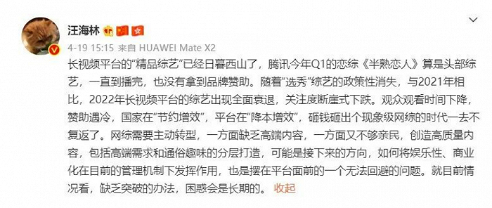 抖快B们正面临超过10亿用户以及不断下降的增长率,如何盘活巨大流量,增强用户粘性和活跃度是平台需要考虑的。入局中长视频,与现有内容形成交叉互补成为新战略,而用户群广阔、容易吸纳广告招商、商业模式清晰的综艺自然成为了发力的方向。2022年,各短视频平台的自制综艺数量都在增加。