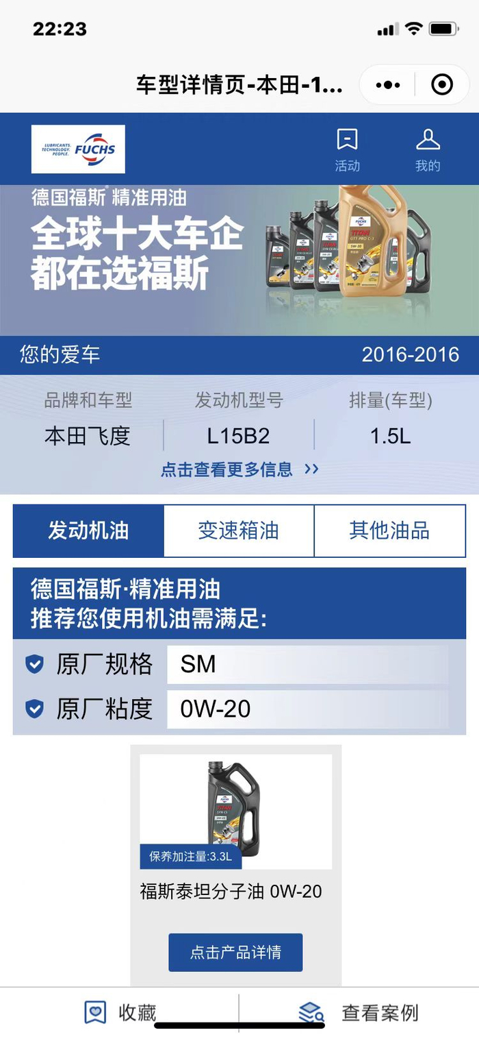 如今是大数据时代,我等“新青年”何至于拘泥于此。我教你一招超级简单的,打开微信,搜索“福斯精准用油”小程序,选择好爱车的品牌、型号、年份后,经过车企认证的机油和变速箱油型号就会跳出来,连具体用量都给你标好了。全程花不了一分钟,简单不?