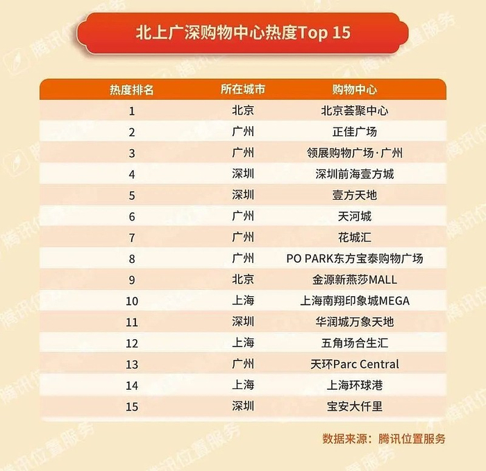 春节期间,壹方天地力压广州的天河城、花城汇,上榜北上广深购物中心热度TOP5,“烟火气”持续升腾。(数据来源:腾讯位置服务)