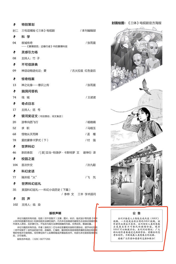 生成式人工智能(AIGC)发展迅猛,ChatGPT等人工智能工具在未来可能渗透进我们生活的方方面面,也对很多行业提出了新的挑战。这两天,科幻迷们发现,4月刊的《科幻世界》杂志上多了一则公告,表示拒绝AIGC投稿。公告上写道:“本刊不接受人工智能生成内容(AIGC)投稿,一旦发现未经注明的AIGC投稿,该作者作品将永不录用。本刊坚信人类的想象力成果具有不可取代的独特价值,绝对AIGC可以相提并论。本刊同时倡议,广大科幻创作者要通过充满科学性、前瞻性的思考和创作,不断延展人类想象力的边疆。”
