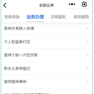 参保人在微信找到“粤医保”微信小程序,刷脸识别登录后,进入应用程序首页,点击左上角切换到当前参保地市,找到【业务办理】——【查看更多】,在【全部业务】页面选择【个人账户主卡消费管理】。