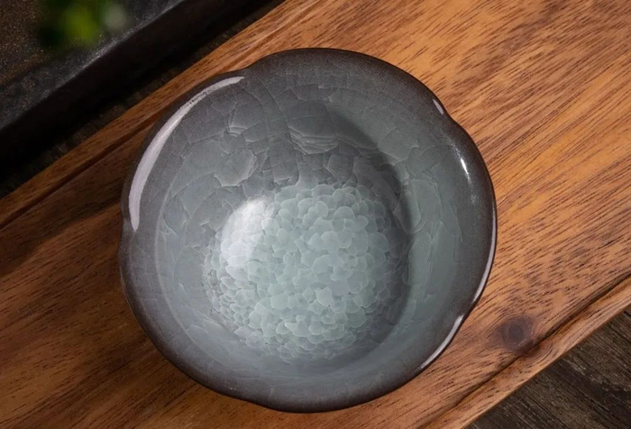 另一款青点冰花葵口杯,则呈现出更为神秘的青中泛蓝之色,犹如站在江面孤舟上深藏不漏的女侠客,美得惊心动魄。