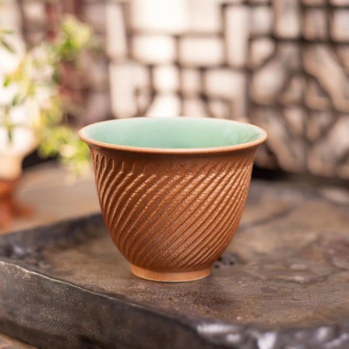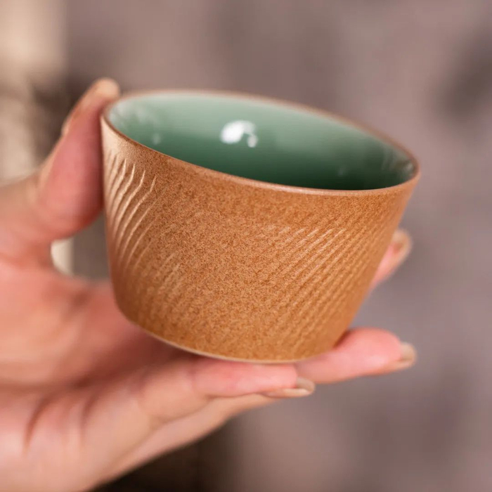 细细端详这款杯子,外部有豪迈的跳刀纹路,内部是细腻的梅子青釉色,如此强烈的视觉反差,也将带来独一无二的美。