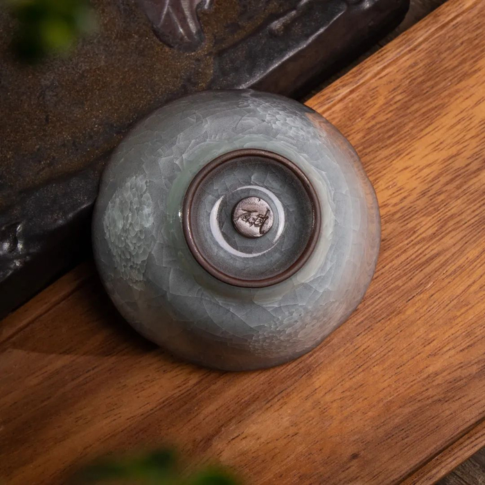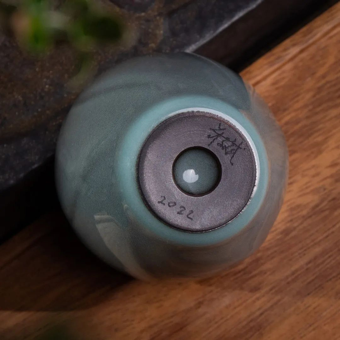 另一款梅子青铃铛杯,采用双色釉,内施梅子青釉,釉厚处可见蚯蚓走泥纹,外施灰釉(草木灰),古朴自然,尽显刀纹。