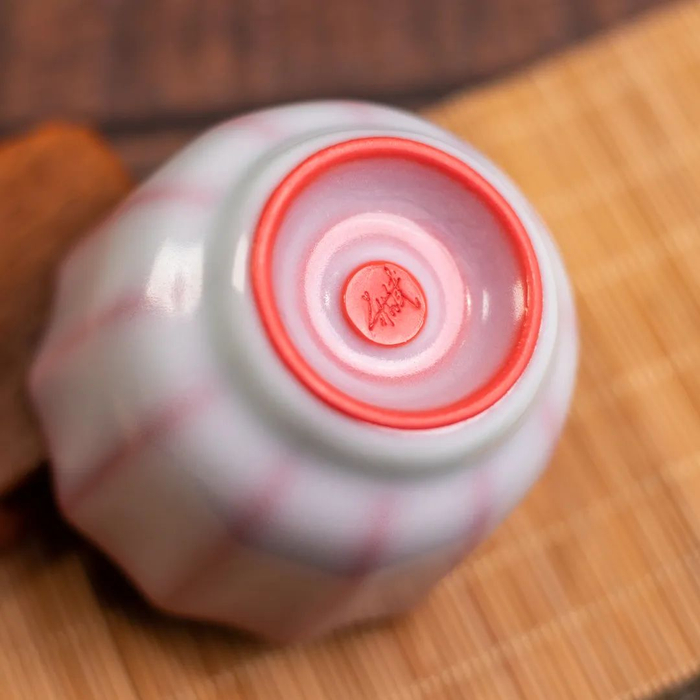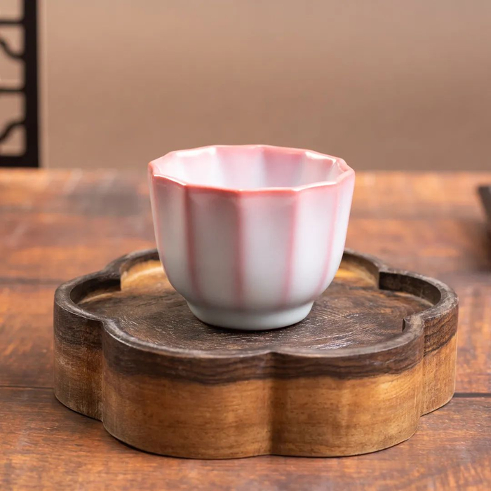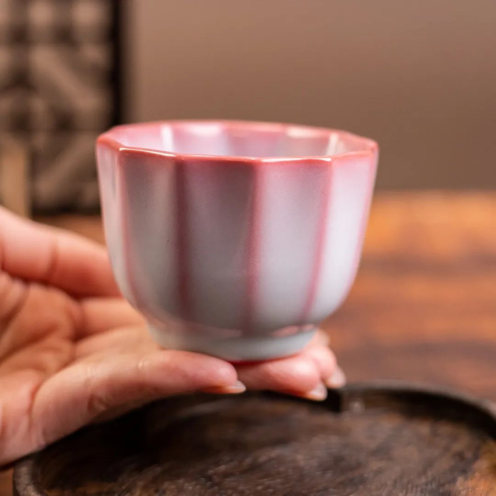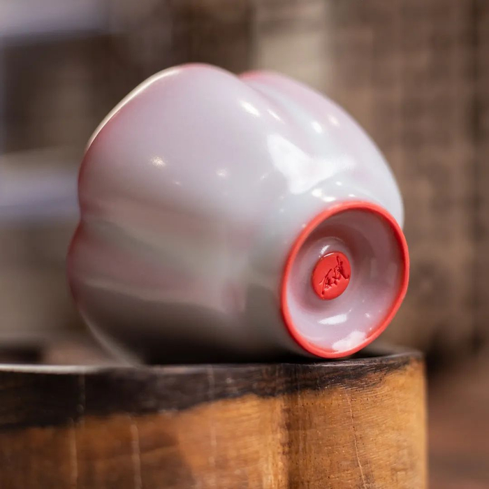 此款桃花红丁香杯80毫升,内里红胎,外施月白釉。