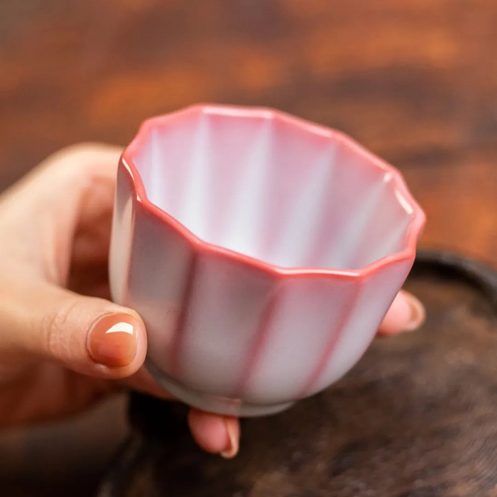 另一款桃花红百褶杯,60毫升的精致容量,满施月白釉,近看釉色肥厚,玉质感极强。