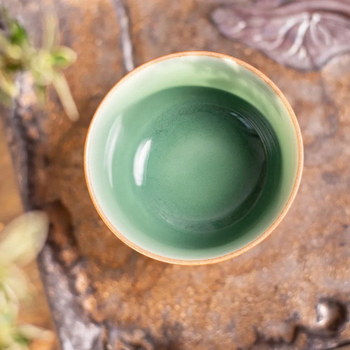 因为含铁量较高,此款青瓷杯胎骨处还呈现出一圈焦糖色,既与杯底交相辉映,又似一圈“花边”围绕,是断不可缺少的一抹点睛之色。