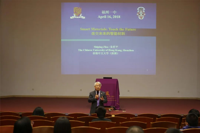 香港中文大学(深圳)副校长朱世平(左一)常年在全国各地中学进行“名师进名校”讲座,上图为朱校长走进福州一中为师生开设前沿讲座。