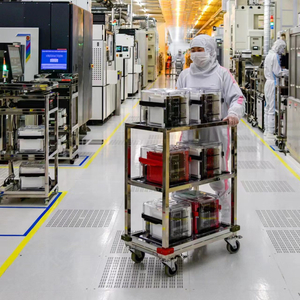 芯片制造的无尘车间空气清洁度要达到ISO 1级,具体说就是每立方米空气当中大于0.1微米的微粒数量不得大于10个。以往,8英寸生产线上的在制品,在各个加工设备之间运转主要采用人工搬送的方式,一线作业人员搬送工作量占比较重,人工搬送过程中也存在振动提升了表面颗粒物增加的风险。