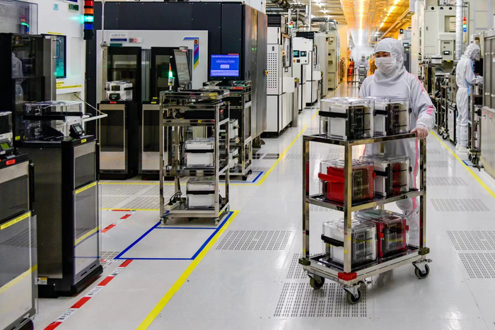 在指甲盖大小的晶圆上头用光刻机刻出电路,然后把数以亿计的晶体管像盖房子一样一层一层地连接起来,这就成为了芯片。生产一颗芯片大约需要两三百个到上千个步骤,每个步骤有几百个变量。这些都不可能是人工完成的,一支超级强大的机器人部队每天在相当于绕地球十圈的流水线上快速运转,日夜不休。