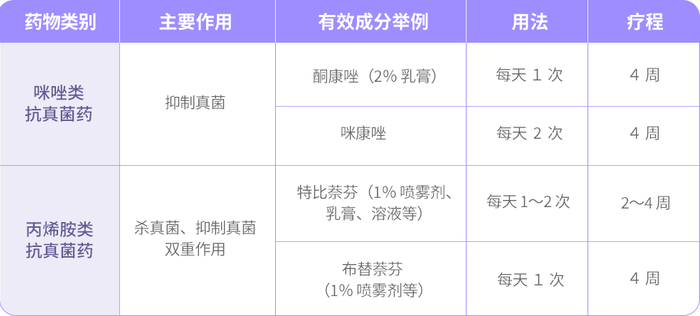 局部治疗抗真菌药物主要是咪唑类、丙烯胺类,有效性差不多,疗程一般是 2 到 4 周。