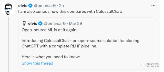 Meta AI专家Elvis激动转发,称这是一件大事,并表示好奇DeepSpeed Chat和ColossalChat相比起来如何。