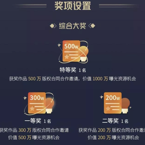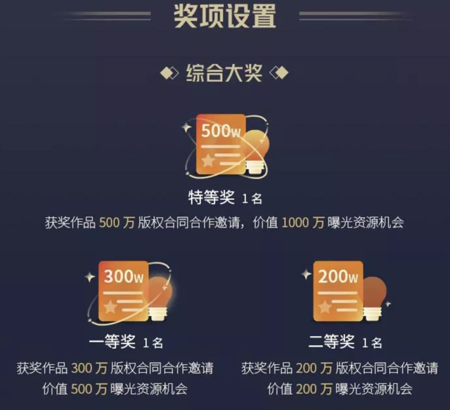 其中特等奖将获得500万合作合同邀请,一等奖获得300万合作合同邀请……具体奖项设置如下图: