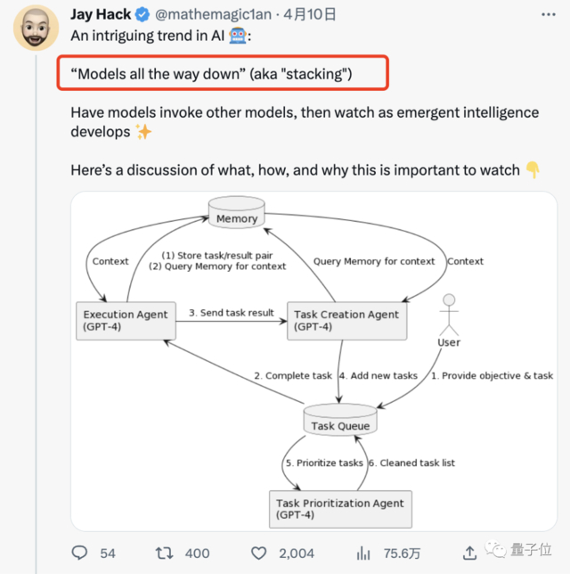 而在推特博主Jay Hack看来,AutoGPT等类似工具的出现,其实证明了智能的本质是“套娃”这件事儿。