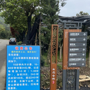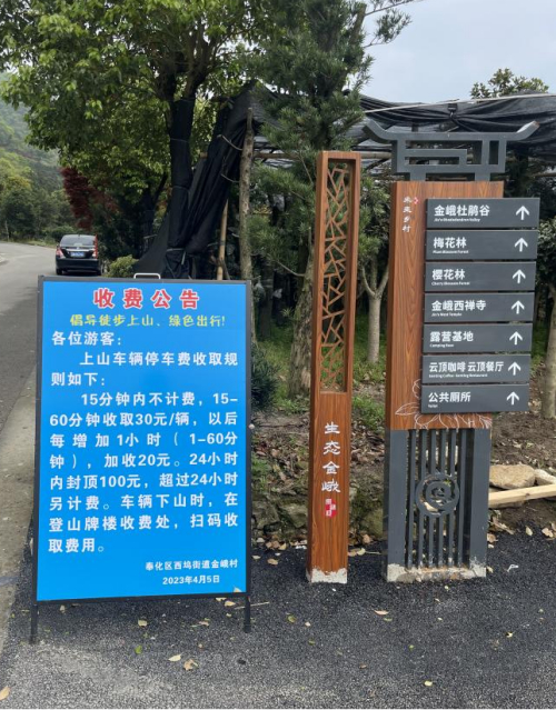 在停车场对面的进山入口处,放着一块收费公告牌,告知游客上山停车要收费,15分钟内不计费,15分至60分钟收费30元,超过一小时每小时加收20元,24小时内封顶100元。
