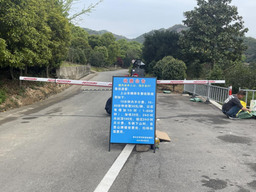 上山路上设置了道闸,路中央立着收费公告牌。