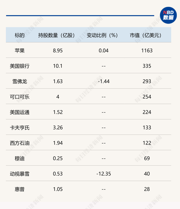 截至去年四季度末,伯克希尔·哈撒韦十大持仓股分别为苹果、美国银行、雪佛龙、可口可乐、美国运通、卡夫亨氏、西方石油、穆迪、动视暴雪和惠普。四季度,该公司没有新建仓股票或清仓股票。