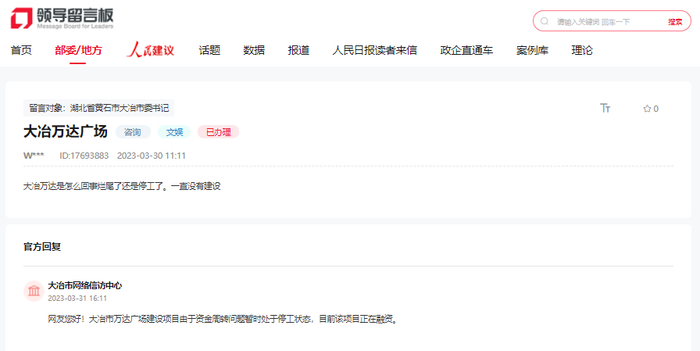 2023年3月30日,有消费者反映大治万达广场不知道是烂尾了还是停工了,一直没有建设。随后大治市网络信访中心回复到,大冶市万达广场建设项目由于资金周转问题暂时处于停工状态,目前该项目正在融资。