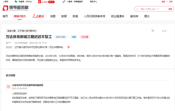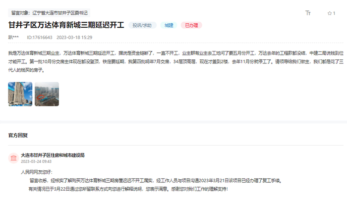 针对上述消费者的投诉,大连市甘井子区住房和城市建设局回复均为:经核实了解购买万达体育新城三期房屋迟迟不开工属实,并要求该项目办理了复工手续。
