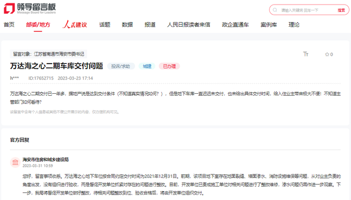 对此,海安市住房和城乡建设局回复为:万达海之心地下车位按合同约定交付时间为2021年12月31日。前期,该项目地下室存在地面裂缝、墙面渗水、消防设施维保等问题,从对业主负责的角度出发,没有组织进行验收,而是督促开发单位抓紧对存在的问题进行整改。目前,开发单位已责成施工单位对相关问题进行了整改维修,渗水问题仍需作进一步观察。下一步,该局将督促开发单位做好整改,待相关问题整改到位、验收合格后,将由开发单位组织交付。(以上截图:均来自人民网领导留言板网站)