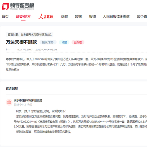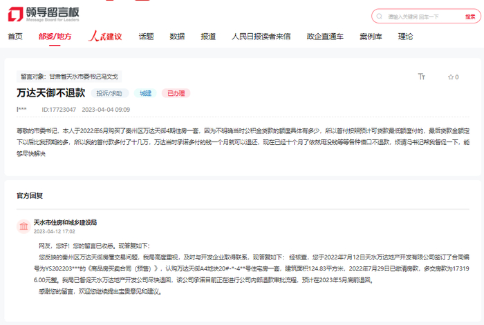 4月12日,天水市住房和城乡建设局回复称:经核查,上述消费者于2022年7月12日与天水万达地产开发有限公司签订了合同编号为YS202203***的《商品房买卖合同(预售)》,认购万达天御A4地块20#-*-4**号住宅房一套,建筑面积124.83平方米,2022年7月29日已缴清房款,多交房款为173196.00元整。该局已督促天水万达地产开发公司尽快退回,该公司承诺目前正在进行公司内部退款审批流程,预计在2023年5月底前退回。