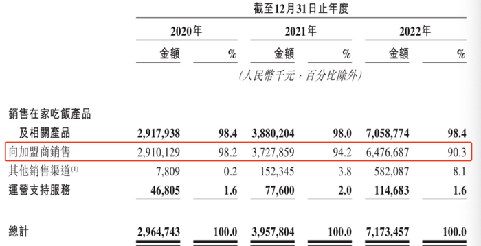 在过去三年时间里,,锅圈从加盟店渠道获得的收入分别为29.1亿元、37.3亿元以及64.8亿元,占同期锅圈总营收的比重为90%以上。