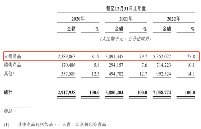 从品类来看,目前锅圈食汇的产品组合包括八大类别,包括火锅产品、烧烤产品、饮料、一人食、即烹餐包、生鲜食品、西餐和零食,合共755个SKU。但锅圈食品近八成的营收依赖于销售火锅产品。2020年至2022年,锅圈食品的火锅产品营收分别约为23.90亿元、30.91亿元与53.52亿元,占总营收的比例分别为81.9%、79.7%与75.8%。