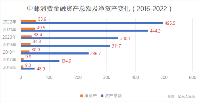 3月30日,中国邮储银行公布2022年年报,其中披露了控股子公司中邮消费金融的经营情况。数据显示,2022年,中邮消费金融实现营业收入60.48亿元,较2021年的56.86亿元同比增长6%;实现净利润4.43亿元,较2021年的12.29亿元同比下降64%;截至2022年末,中邮消费金融总资产495.53亿元,较上年末的444.22亿元同比增长11.6%,净资产53.87亿元。