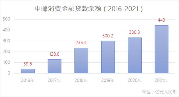 2016年-2021年,中邮消金的贷款余额从39.8亿元增长至443亿元,规模扩大10倍。根据中邮消金披露数据,截至2019年6月,中邮消费金融累计发放贷款总额为1062亿元;截至2023年初,中邮消金累计发放贷款已经达到5000多亿元。