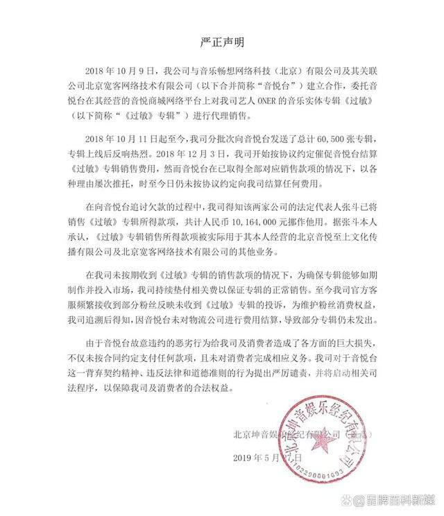曾因债务原因被“北京坤音娱乐经纪有限公司”告上了法庭。坤音娱乐的有关资料显示,音悦台及关联公司未向坤音娱乐结算《过敏》专辑的销售费用,并且销售所得款已被挪作他用。