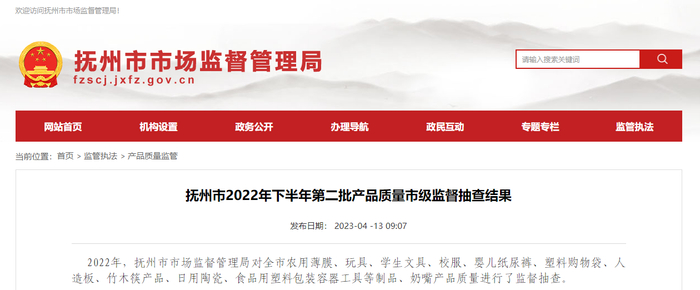 江西省抚州市公布2022年下半年第二批产品质量市级监督抽查结果