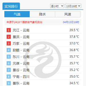 16时气温排行榜9地在云南,其中元江最高39.5℃
