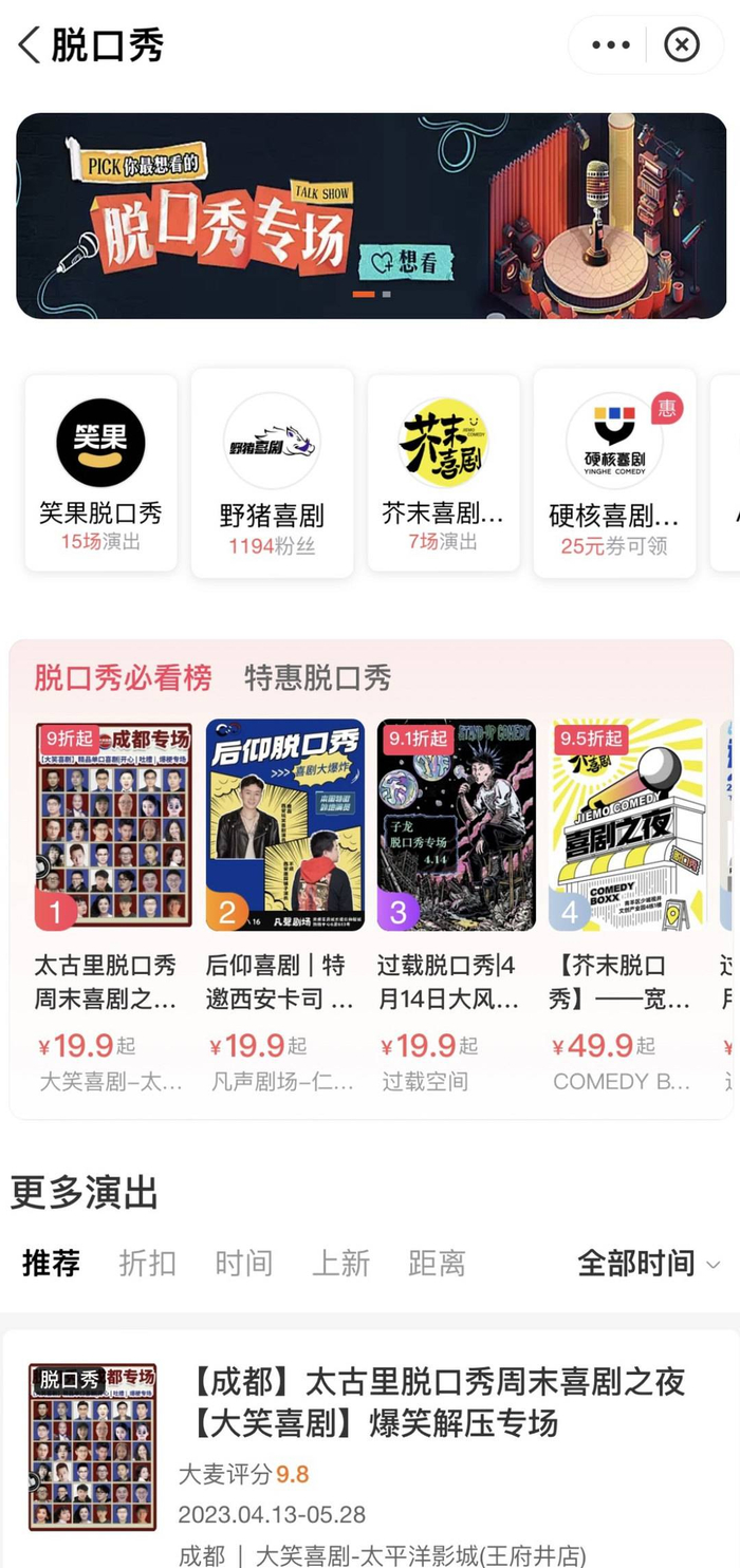 除了音乐节和演唱会,周末和三五好友约着看脱口秀、话剧、即兴喜剧的消费者越来越多。记者打开票务平台发现,仅脱口秀品类,在成都有演出的厂牌就多达8个以上。