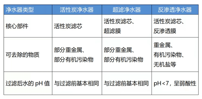 来看一下常用净水器的核心部件,并看看它们分别能去除什么,然后消费者可以按需选择: