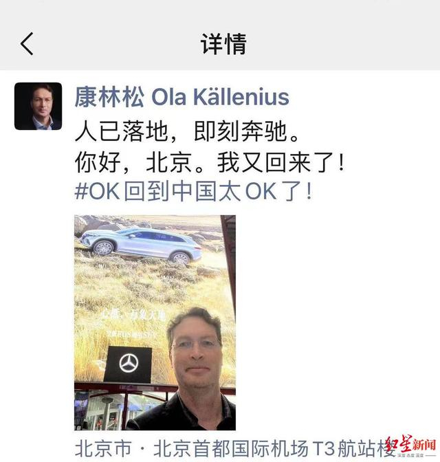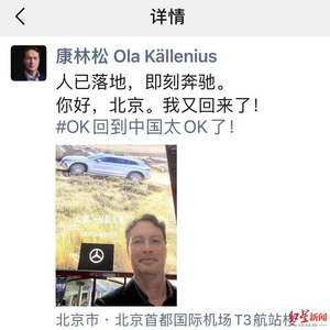 梅赛德斯-奔驰集团股份公司董事会主席康林松早早就来到了中国,4月10日,他抵达北京,并在朋友圈发文“你好,北京。我又回来!#回到中国太OK了!”透过文字能感受到他的激动。在康林松的带队下,奔驰集团众多高管都将出席上海车展。