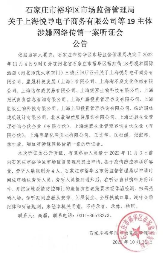 据河北省石家庄市裕华区政府网站2022年10月31日消息,上海悦导电子商务公司等19主体涉嫌网络传销一案听证会于11月4日在石家庄召开,涉案主体包括张庭夫妇(张淑琴、林吉荣)、陶虹等。
