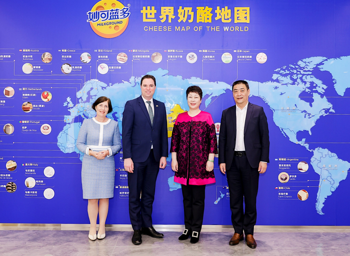 (从左至右)爱尔兰驻华大使安黛文、爱尔兰农业食品与海事部国务部长马丁·海登、妙可蓝多创始人、CEO柴琇、妙可蓝多执行总裁任松