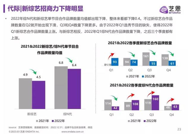 “以前二线卫视的户外真人秀,一个独家冠名四五千万都很容易,但如今品牌方不会再这样大方了。”六六说,谨慎的品牌方们,往往更愿意投更保险的综N代,这就让大量的新节目直接被毙掉。《2021综艺年度洞察报告》数据显示,全年上线综艺数量达到428档。2022年,全年上线的综艺数量则下滑至290部左右。