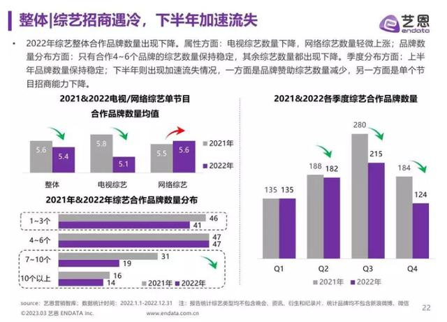 过去上亿的冠名,如今也难再见了。根据艺恩数据,2022年综艺整体合作品牌数量出现下降,从2021年的787个降至656个。