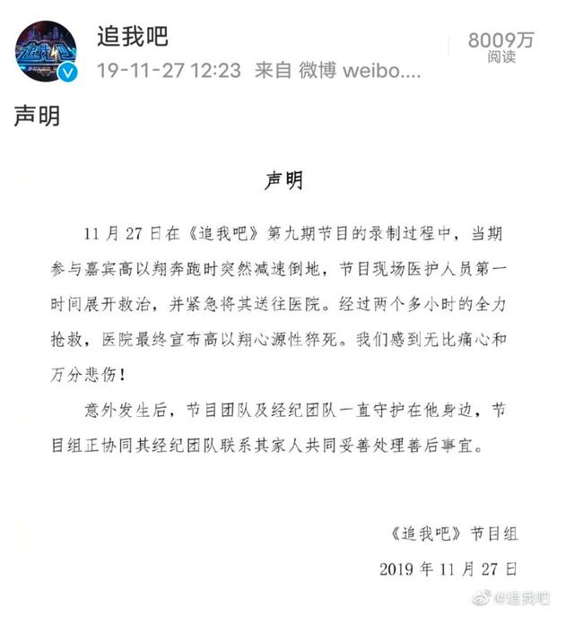 2019年11月,演员高以翔在参加浙江卫视真人秀《追我吧》录制时,因意外离世,立即引起巨大的争议。当时就有媒体报道称,嘉宾们在这档节目里需要做很多高难度运动,且运动强度很大,如梅花桩、飞檐走壁、徒手爬高楼等。同时,节目在夜间通宵录制。