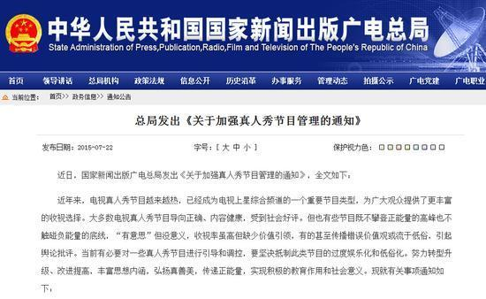 2015年7月,原国家新闻出版广电总局发布《关于加强真人秀节目管理的通知》,要求真人秀节目努力转型升级、改进提高,丰富思想内涵,弘扬真善美,传递正能量。紧接着的8月25日,总局再度举办真人秀节目培训班,要求真人秀节目要摒弃讲排场、拼明星的错误做法,吸纳更多各行各业基层群众参与。