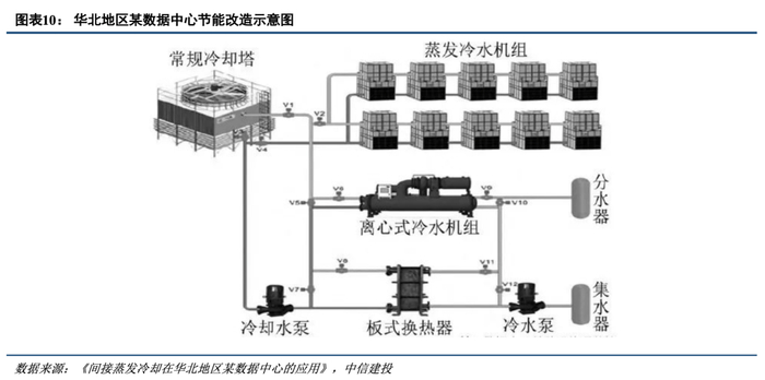 根据《间接蒸发冷却在华北地区某数据中心的应用》数据显示,华北地区某数据中心一期IT备总负荷为3150kW,采用集中式冷水机组+房间级空调末端的供冷架构,机房年均PUE为1.4,采用新增间接蒸发冷却冷水机组的技术措施对一期机房实施节能改造后,机房年均PUE降至1.28。但值得注意的是,“东数西算”枢纽节点对于PUE的要求为1.25或1.2以下,采用冷冻水或间接蒸发冷却(风冷)方案在某些高温、高湿地区可能无法严格满足上述要求,因此我们预计液冷方案渗透率有望加速提升。