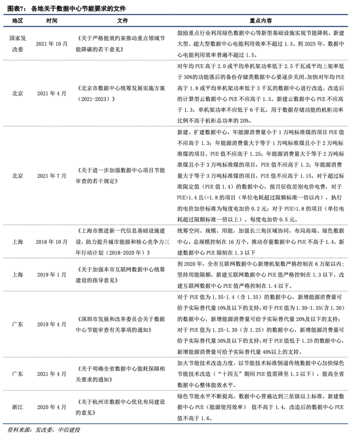 当前我国数据中心年用电量已占全社会用电的2%-3%左右,东部核心地区针对数据中心PUE已经提出严格要求。为确保实现“碳达峰碳中和”目标,需要在数据中心建设模式、技术、标准、可再生能源利用等方面进一步挖掘节能减排潜力。多地已针对数据中心的绿色低碳发展提出规划方案。北京发布《北京市数据中心统筹发展实施方案(2021-2023年)》,提出将有序关闭腾退低利用率的数据中心,新建云数据中心更强调“绿色”,PUE不高于1.3,用于数据存储功能的机柜功率占比不超过20%;广东省能源局2021年4月发布《关于明确全省数据中心能耗保障相关要求的通知》,明确提出“利用市场和行政手段,推动绿色低碳发展”,要求加大节能技术改造力度,“十四五”期间PUE降至1.3以下;上海在2019年发布的信息基础设施三年行动计划中提出,新建数据中心PUE限制在1.3以下,存量数据中心PUE不高于1.4。