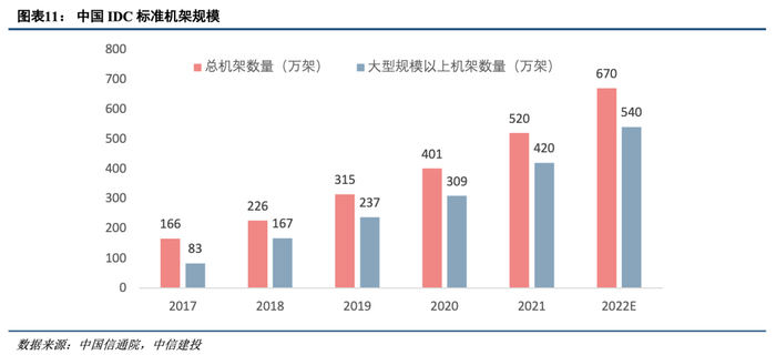 在数字中国和人工智能推动云计算市场回暖的背景下,IDC作为云基础设施产业链的关键环节,也有望进入需求释放阶段。在过去两年半,受多重因素影响,云计算需求景气度下行,但IDC建设与供给未出现明显放缓情况,2021年和2022年我国分别新增标准机柜数量120万架和150万架(按2.5kW进行折算)。随着宏观经济向好,平台经济发展恢复,AIGC等拉动,IDC需求有望逐步释放,虽然2023新增供给量有望较2022年减少(例如三大运营商2022年新增IDC机柜15.6万架,2023年计划新增11.4万架),但在“东数西算”工程加速建设的大背景下,预计每年国内IDC机柜增加量仍有望在100万架左右。