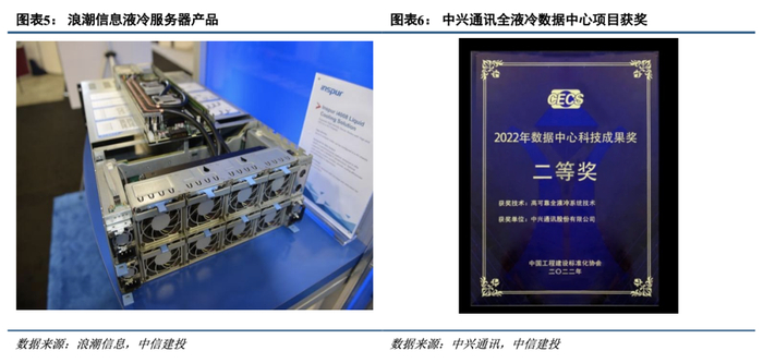 无论是冷板式液冷还是浸没式液冷,都需要数据中心温控和ICT设备厂商彼此配合,此前市场对于产业链的协作问题存在疑虑。目前在AI算力需求的推动下,服务器厂商已经开始大力布局液冷服务器产品,液冷的产业化进度有望加速。2022年,浪潮信息将“All in 液冷”纳入公司发展战略,全栈布局液冷,实现通用服务器、高密度服务器、整机柜服务器、AI服务器四大系列全线产品均支持冷板式液冷,建成年产能10万台的亚洲最大液冷数据中心研发生产基地,实现了业界首次冷板式液冷整机柜的大批量交付。2022年,中兴通讯发布了《中兴通讯液冷技术白皮书》,公司建设的全液冷数据中心项目获得了2022年CDCC数据中心科技成果奖,近期公司 G5系列服务器在泰国进行海外市场首发,支持液冷散热技术,采用冷板式液冷散热。