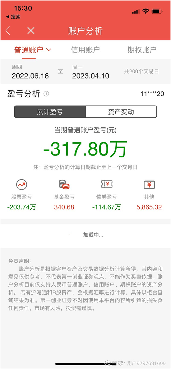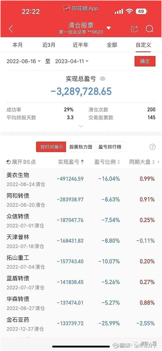 另一位用户也在雪球上发帖,佐证了这件事情。从晒出的账户具体交易记录来看,2022年6月16日到2023年4月11日,该账户交易200次,平均持股3.3天,合计亏损超过300万元。