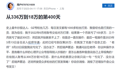 “用户9797631609”发文称,因为信任,2022年6月将账号交给某大V打理,结果第一个月就亏了100多万,三个月就亏了接近300万,然后就开始联系不上了,但是还一直在操作,最后一笔操作是2023年3月13日全仓买入哈焊华通,此时已经亏到仅剩20万。此后,该用户继续发帖称,大V为“思辰超短逻辑”。