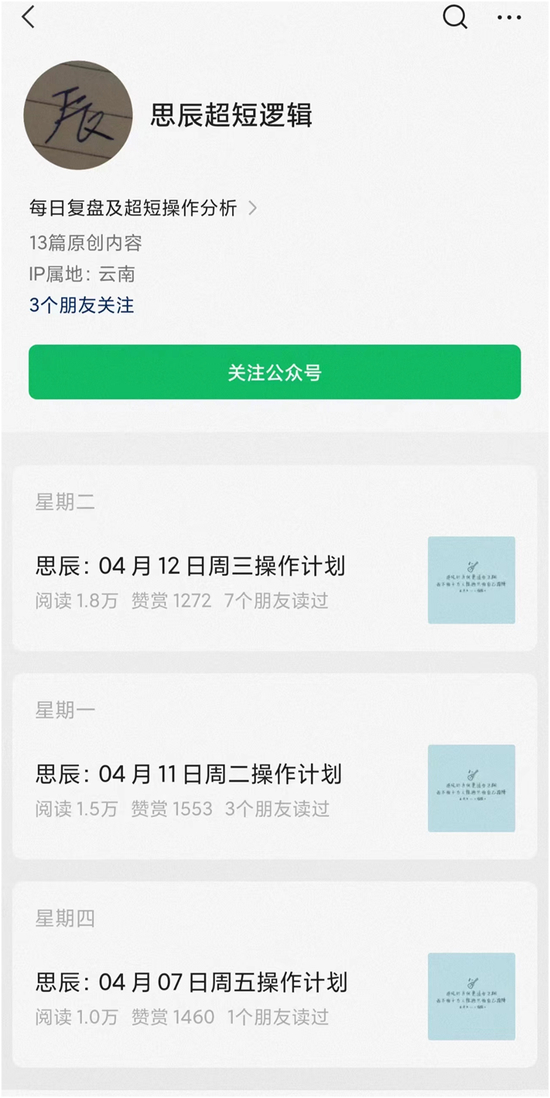 记者梳理发现,在微信公众号里,“思辰超短逻辑”最新发文是4月11日深夜,主要讲述4月12日操作计划。从该公众号发布的最近几篇文章来看,阅读量均超过1万,赞赏人数超过1000人。