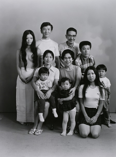 后左起,妻子洋子、弟弟了晖、父亲助造、妹夫大光寺久,前左起,弟妹明子、妹妹的长子学、母亲みつゑ、弟弟的长女今日子、妹妹可南子、弟弟的长子卓也,1971年。选自《家族》