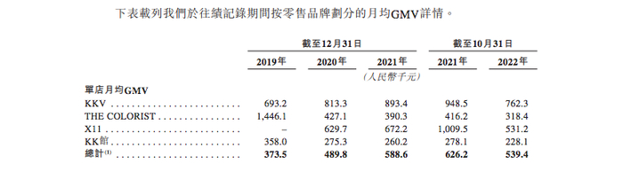 以潮玩X11门店为例,2022年前10个月,门店单店月均GMV下滑47.43%,其余KKV、KK馆、调色师也同期分别下滑21%、20%、19%,迫使许多加盟商闭店停业。2020年KK集团的加盟店还有424家,到2021年,这一数量迅速减少至357家,再到2022年10月末,加盟店仅剩145家。